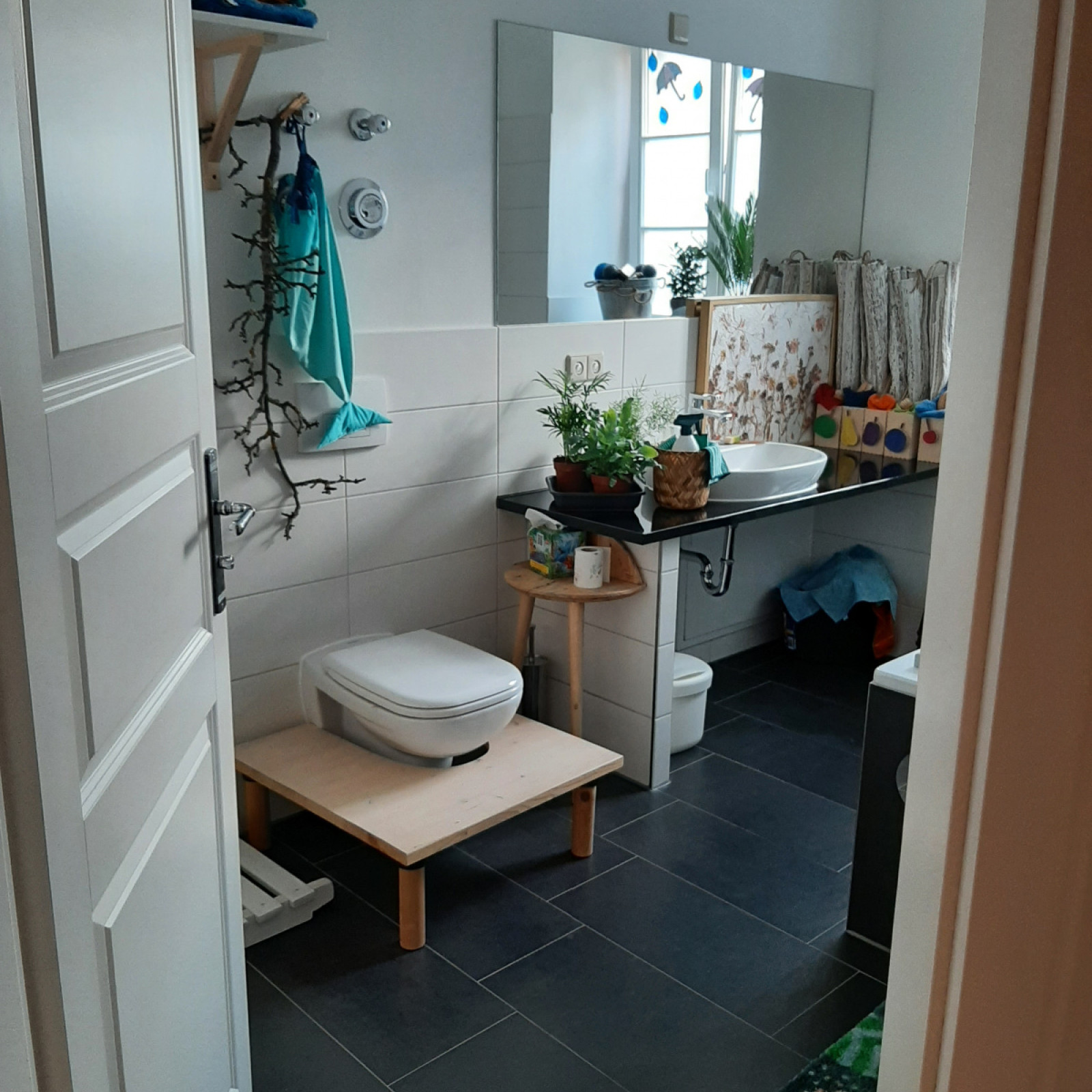Die Kinder haben ihr eigenes, begehbares Kinder-WC, Stabile Tritthocker für den Waschtisch sorgen für eine bequeme Erreichbarkeit und fördern die Selbstständigkeit der Kinder.