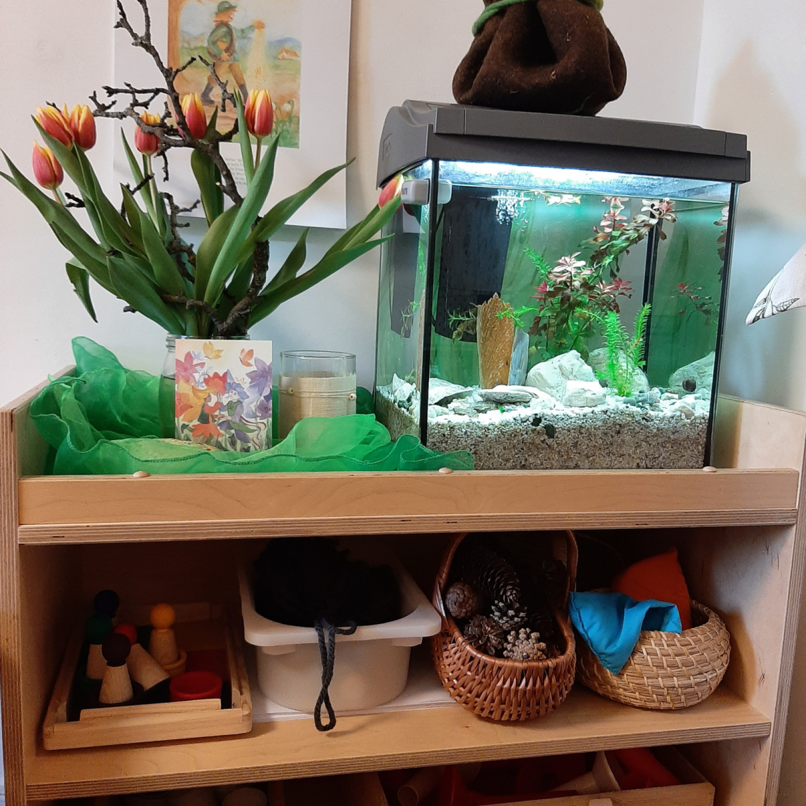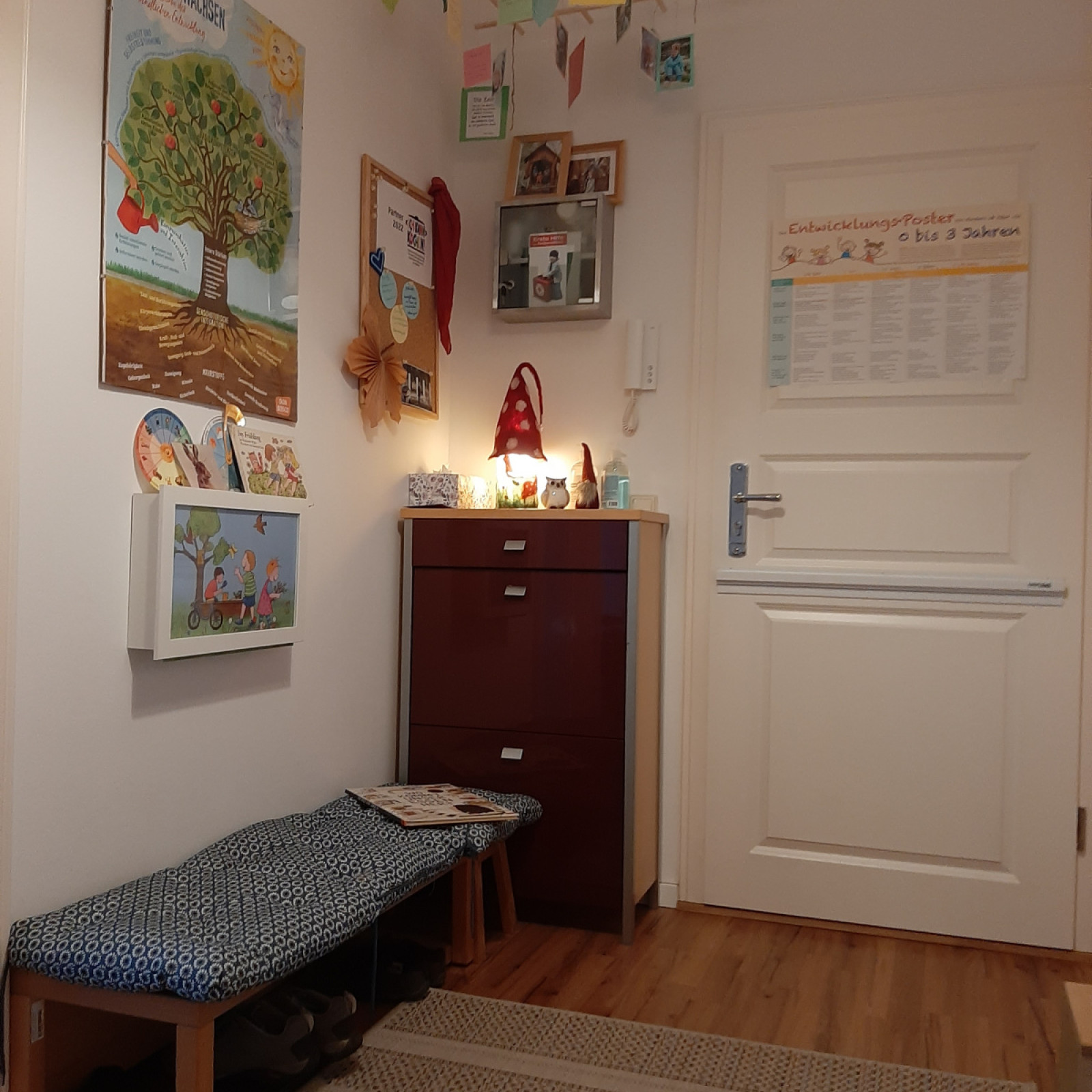 kleine Holzhocker für die Eltern und ein Jahreszeitenkasten, Leiste mit den