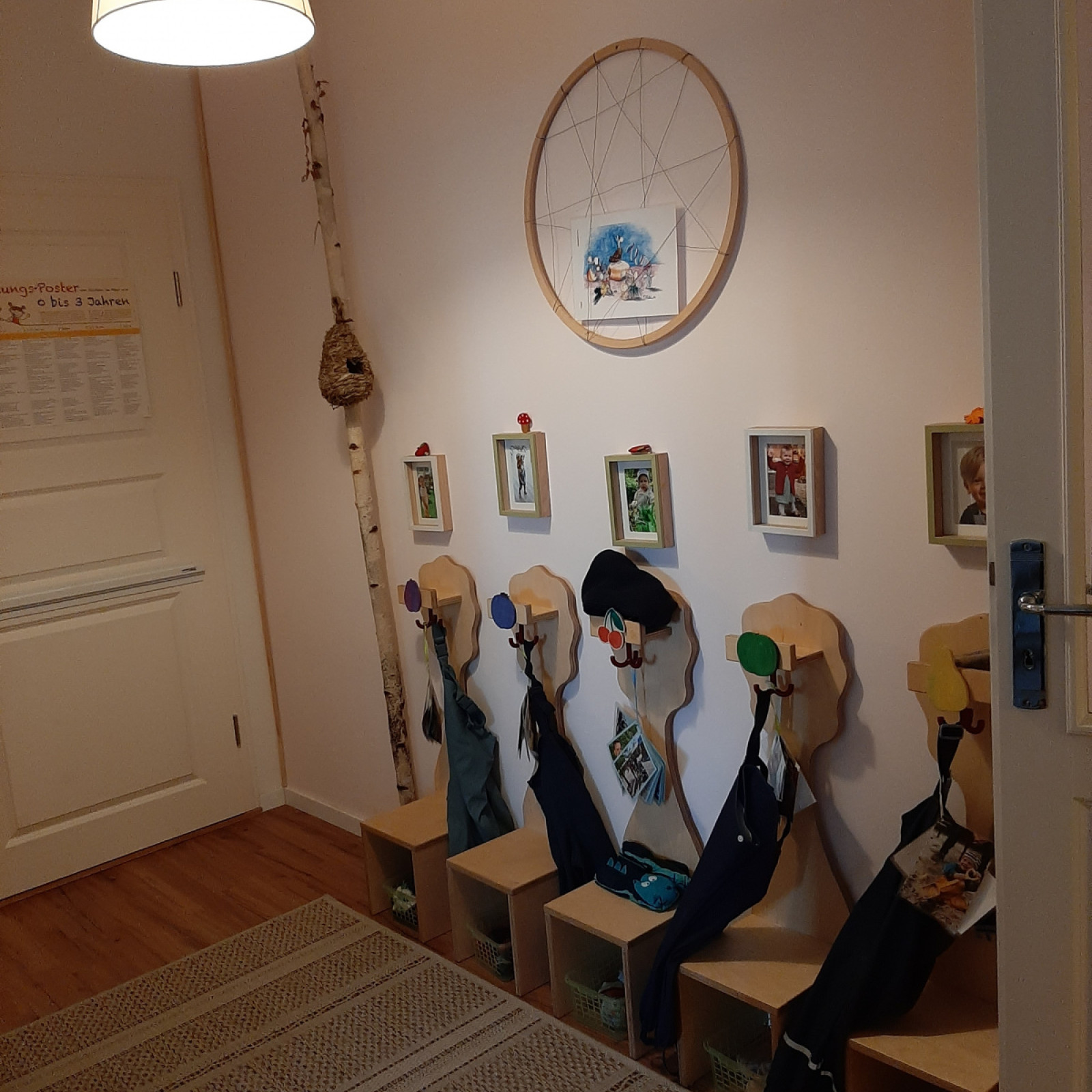 Er verbindet die gesamten Räume . Hier befinden sich die Garderoben der Kinder. Jedes Kind hat einen eignen Garderobenbaum mit seiner Erkennungsfrucht. Über jedem Baum hängt ein Foto des Kindes.