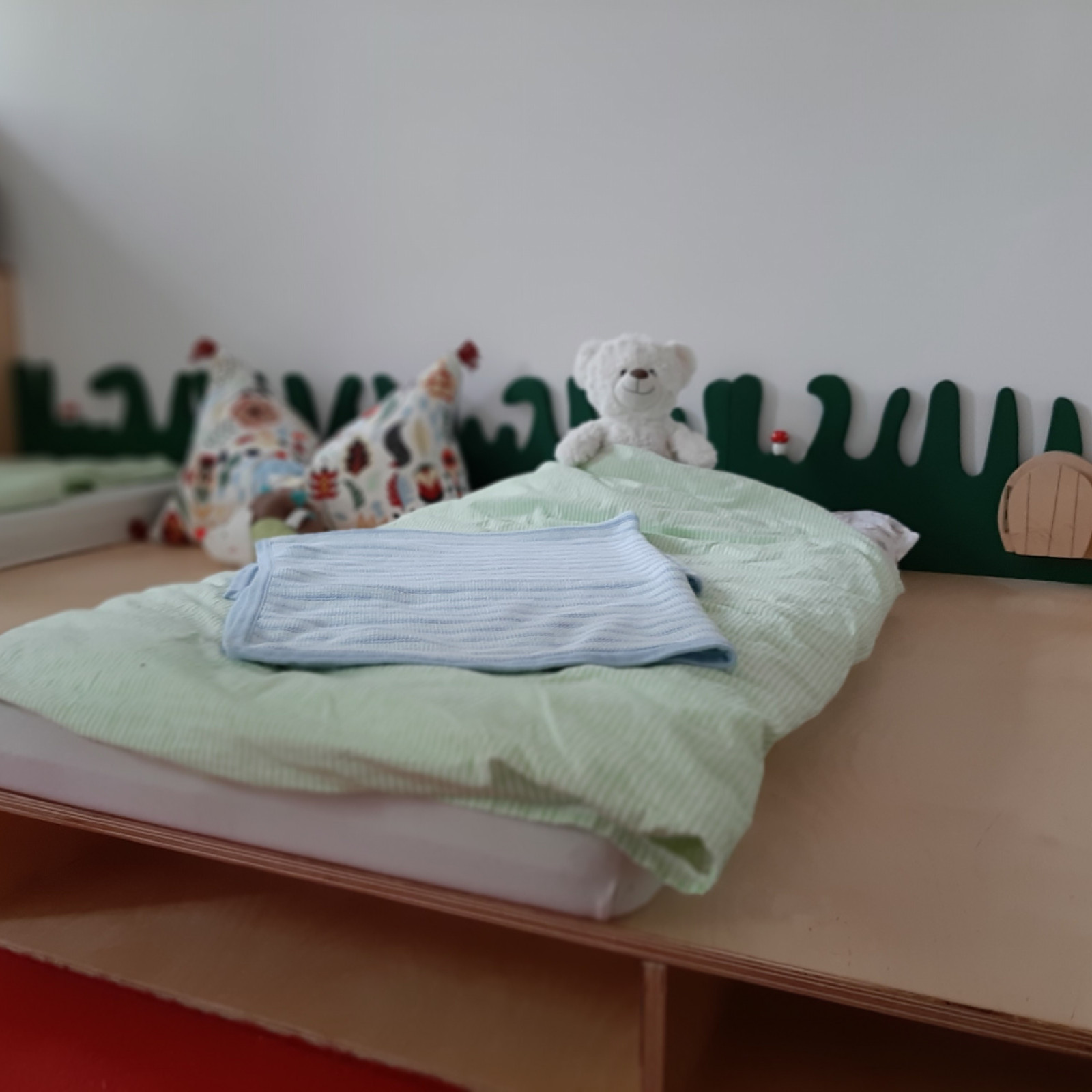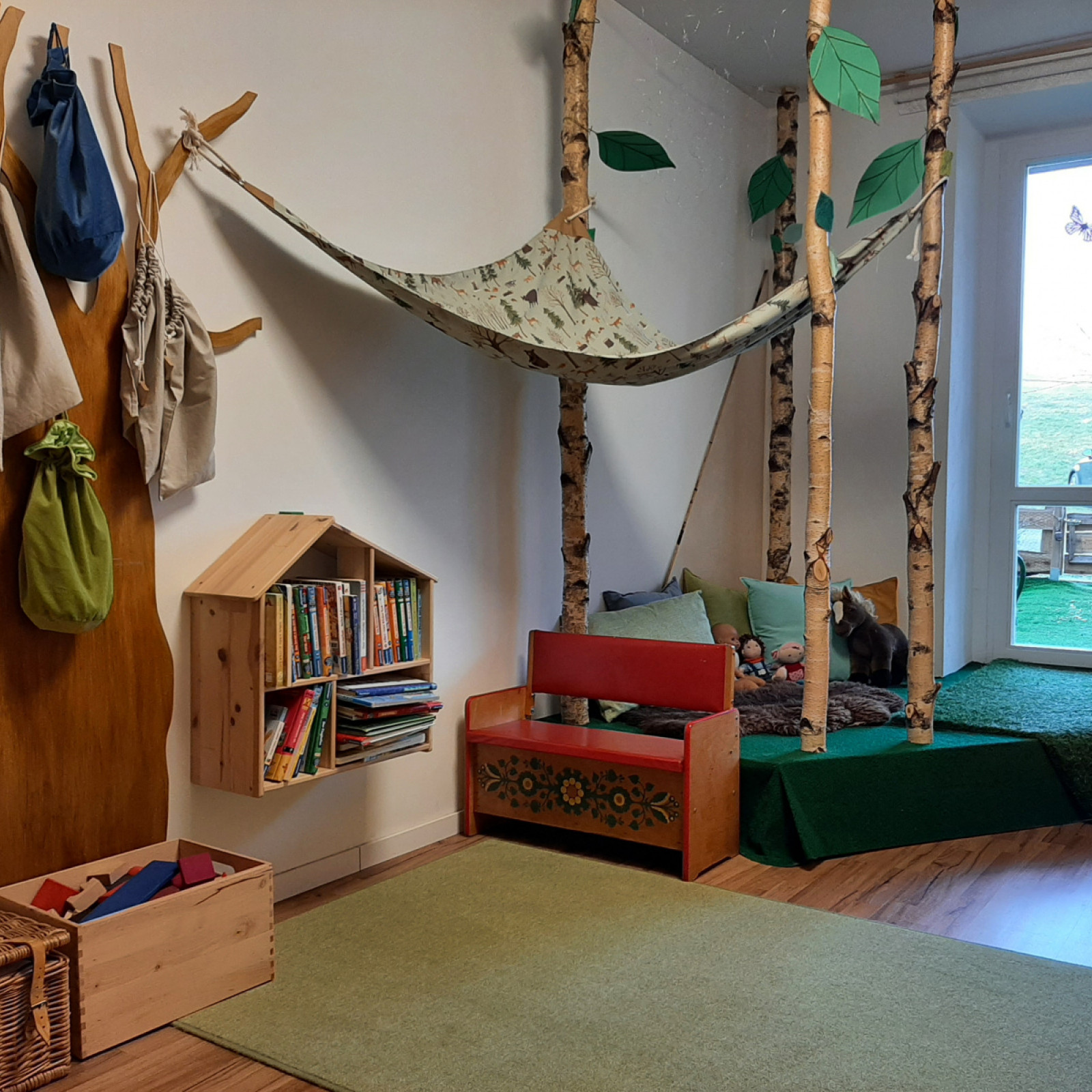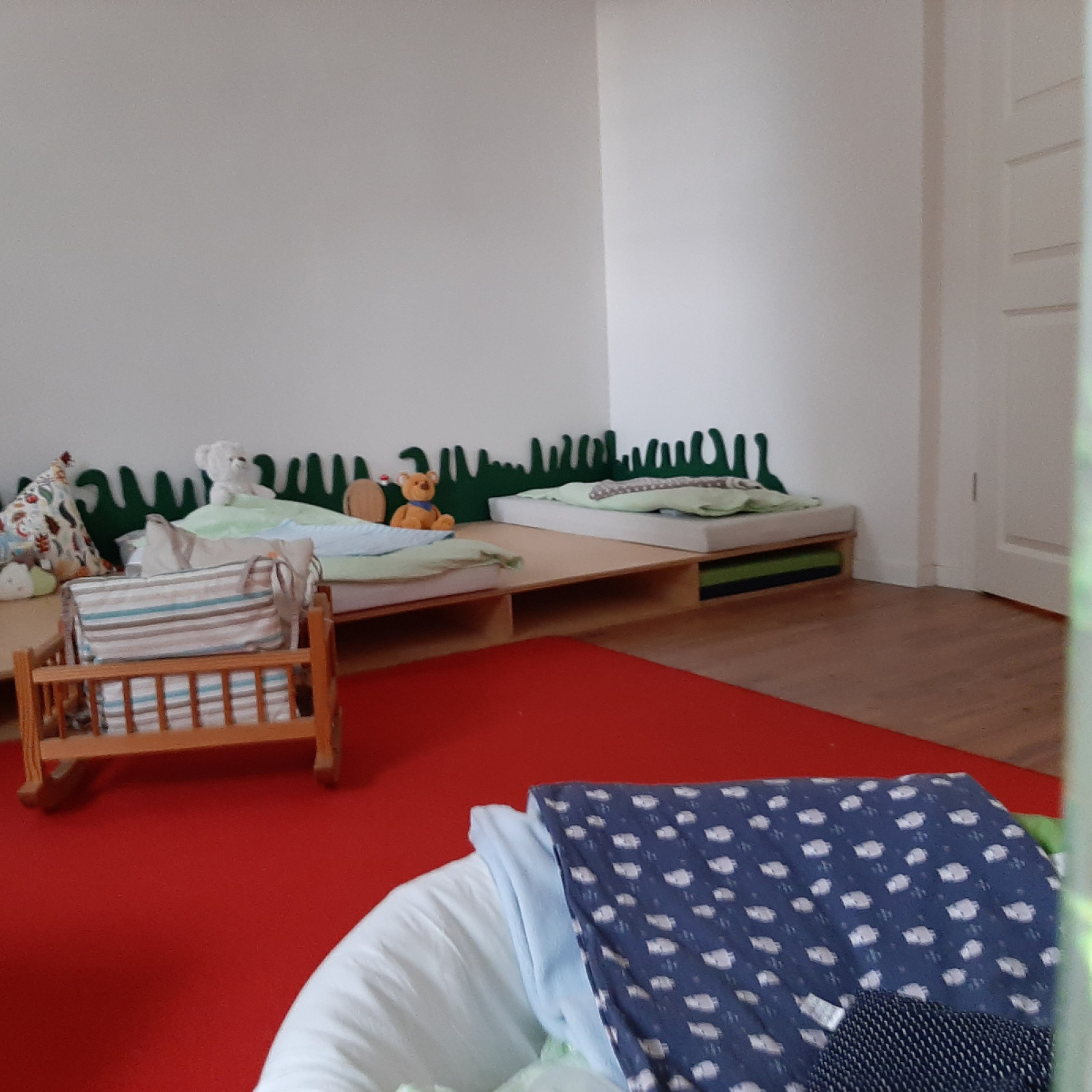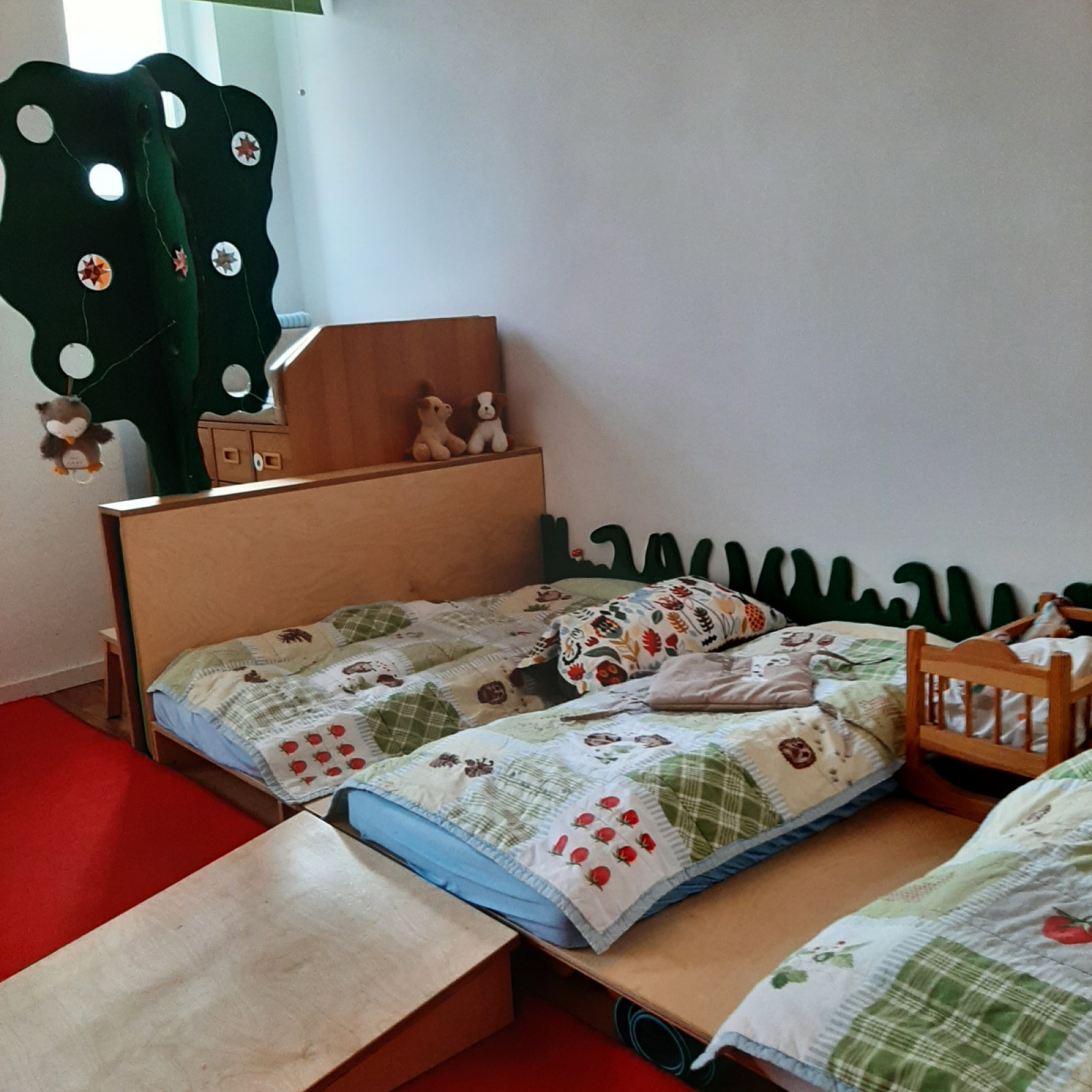 Der Schlafraum ist mit einem großen begehbaren Wickeltisch, einer Trennwand, in Form eines Apfelbaumes, welcher als Sichtschutz dient, ausgestattet. Lichtundurchlässige Rollos sorgen für eine entspannte Mittagsruhe.