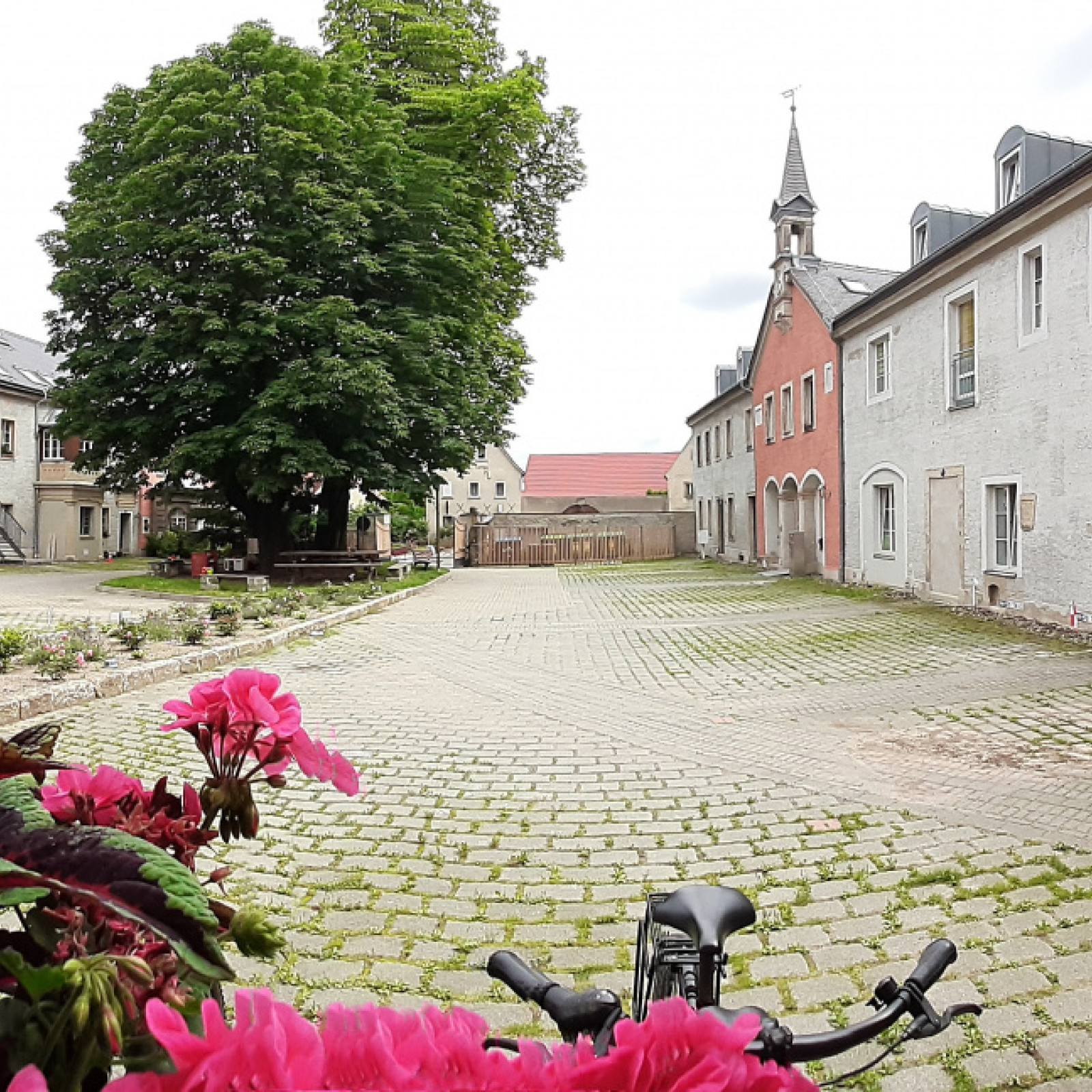 Uhrtürmchen, einer kleinen Gasse und einem gemeinschaftlichen Innenhof, mit