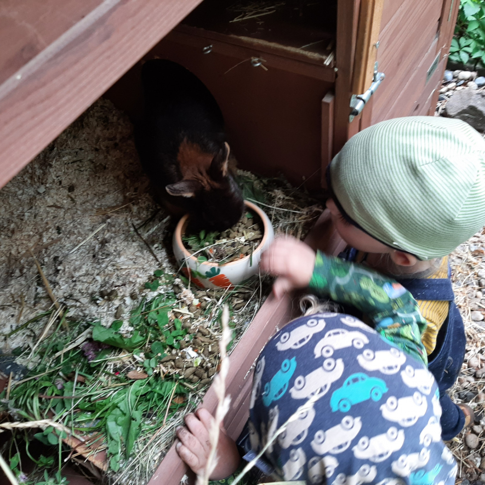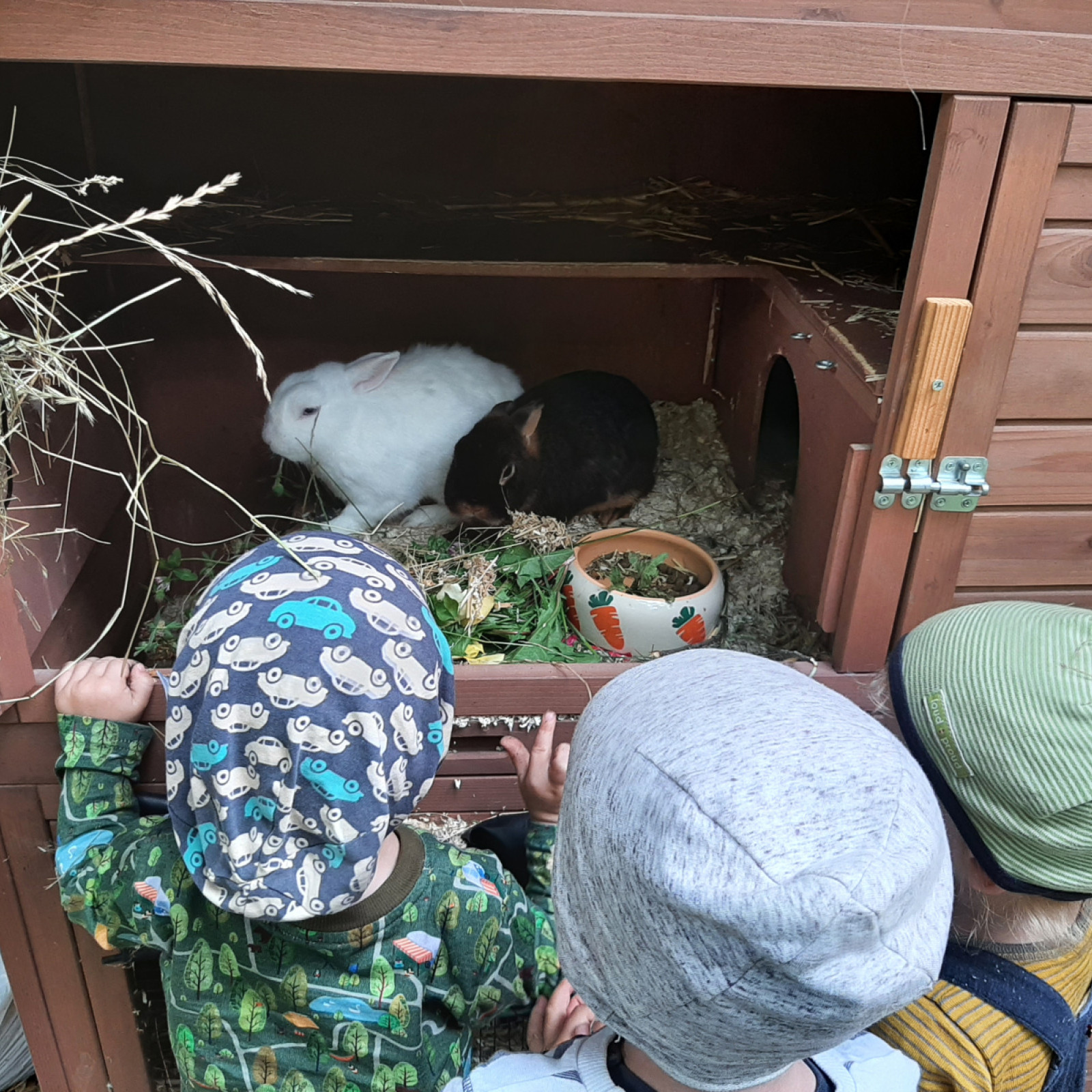 Unsere Kaninchen befinden sich hinter dem Haus.